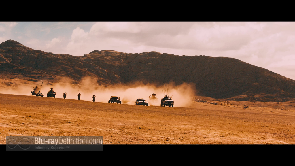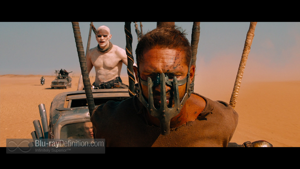 Wow! Mad Max: Fury Road is what high definition is supposed to look like. Shot on the Arri Alexa M and Arri Alexa Plus with Panavision Primo lenses, and also utilizing the Blackmagic Cinema Camera, Canon EOS 5D Mark II, and Olympus P5 cameras for certain shots, this all digital production arrives on Blu-ray (and Blu-ray 3D) in an AVC/MPEG-4 1080p transfer (MVC for 3D) that looks absolutely stunning. The highly stylized production has a surprisingly wide color palette given it takes place in a desert wasteland, and those colors – cerulean skies, golden sands, and carmine horizons – pop with beautiful saturation from the screen. The picture is clear and crisp, detailed, and there is great depth of field, even in the 2D version. The 3D is a a conversion, sadly. This movie would have been spectacular in a native 3D production, but, that said, the 3D conversion is one of the better ones, but still does not reach the same level of naturalness and pop-out of the best of the native 3D films like Avatar, Gravity, or the Resident Evil franchise, as an example. It adds some depth and a slight bit of pop-out, but nothing that really leaves the screen in a natural way.