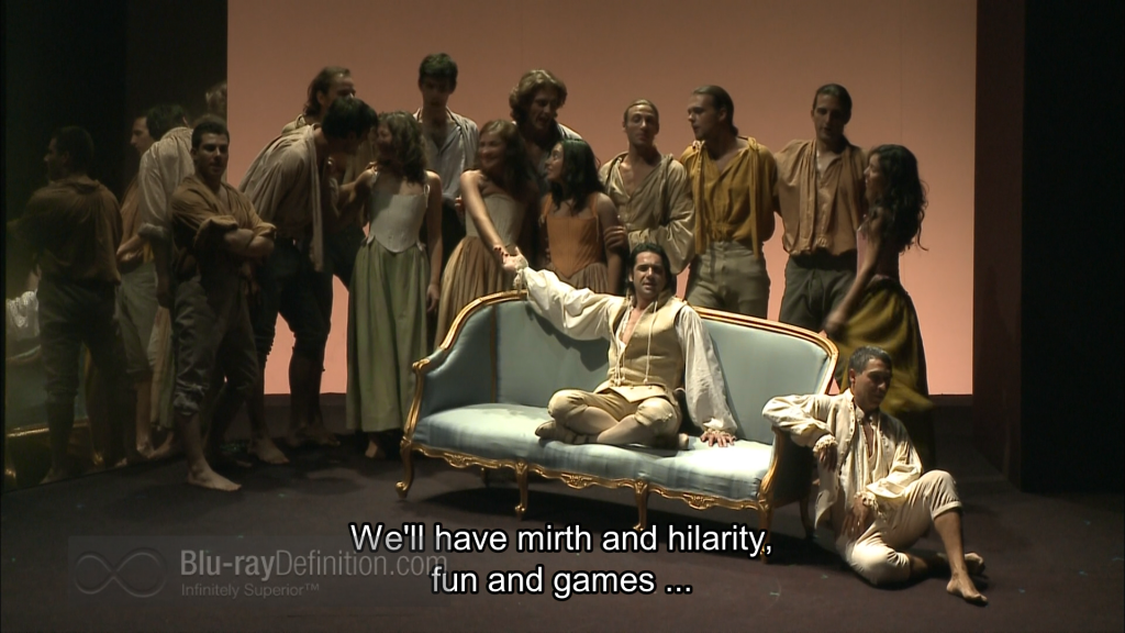 Don Giovanni is one of the pillars of the operatic repertory and, since its premiere in 1787, it has been subjected to countless reinventions. The risk in applying a reconceptualization to a classic work is that it will distract viewers from the essential nature of the original opera. This is mostly what we get here. More is the pity since D’Archangelo’s Don is very well sung and acted at least in line with the unsympathetic lecherous bent that the director has given his character. With a number of better DG’s already out there (like the two Covent Garden versions), this is one Blu-ray that can be readily bypassed.