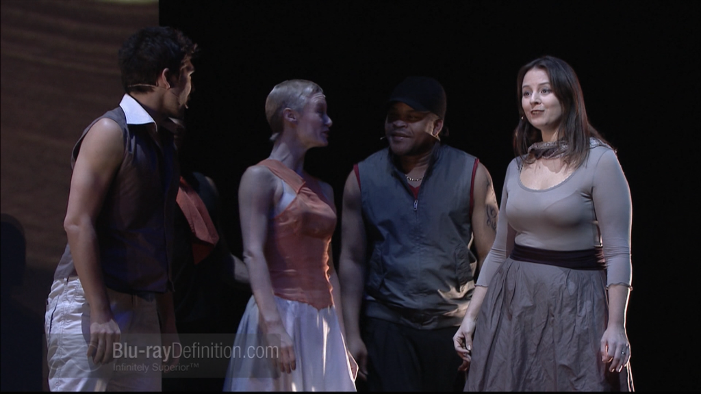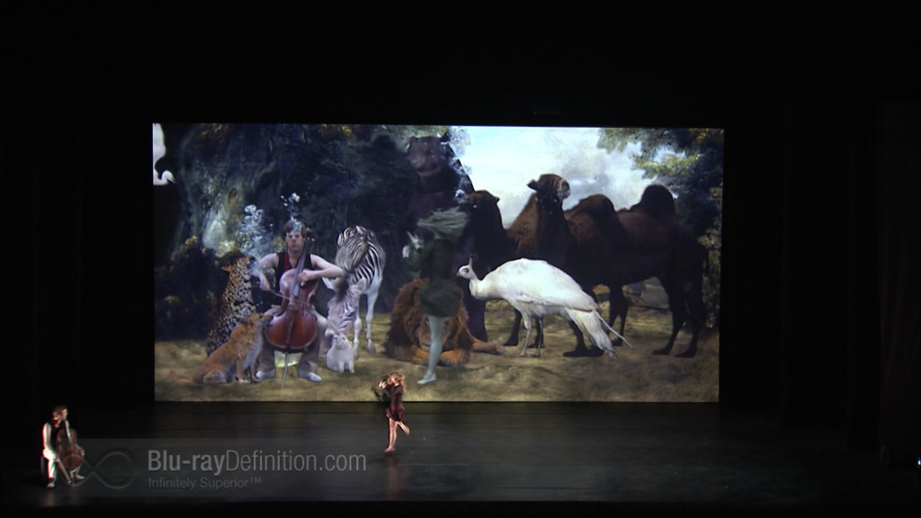 The videographers are kept constantly busy by the frenzied stage business and, to their credit, do a remarkable job in following the action. Colors and details are first rate. There are some interesting special effects on the screen as human faces morph into those of animals and back again and the characters on film often mirror the actions of those on stage.