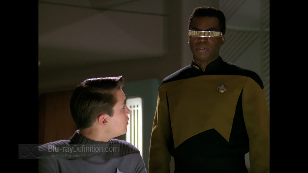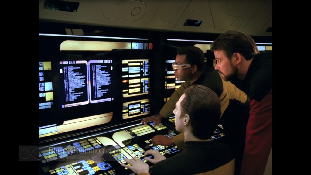 The Next Generation on Blu-ray looks every bit as good as I suspected it would, especially with the track record of this franchise on Blu-ray so far. As most people will already have heard by now, for The Next Generation releases on Blu-ray, they haven’t just remastered from the existing completed film masters, but they have gone back to the original camera negatives and redone all the visual effects composites – originally done in standard definition – in high definition. The end result are visual effects that are clearer, sharper, and more detailed than ever before. This AVC/MPEG-4 encodement, framed in the original broadcast framing of 1.33:1, looks amazing, with a fine grain structure and beautiful colors. Those Starfleet uniforms in their glorious reds, yellows, and blues look fantastic while the Klingon uniforms yield intricate detail and texture. If there is one problem, it is that flesh tones might suffer slightly from pushing a bit too much towards a reddish look in certain spots, but it’s a minor issue.