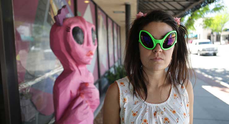 We get a struggling actress, Grace Genet (Alex Essoe), studying for a role as a stripper who is trying to make her way to Las Vegas and gets a ride with a hustler trying to make a living as both a cab driver and a tour guide in Los Angeles; there’s a hitchhiking poet (Jeremy O. Harris) who heads from the bright lights of Vegas and hitches a ride with two strange, pseudo-religious women (musical duo Birdcloud who also appear on the soundtrack) out to Utah’s Salt Lake, then another woman looking for aliens in Area 51.