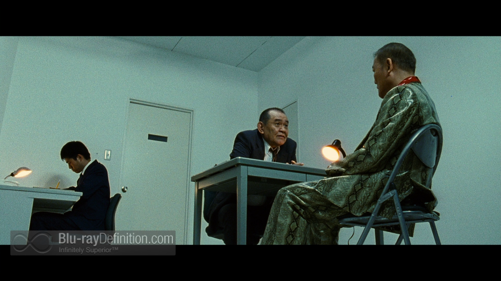 We get a very fine Japanese DTS-HD Master Audio 5.1 (48kHz/24-bit) soundtrack that is balanced, atmospheric and engulfs one with solid effects during the crescendo of violence in the balletic final violent clash between yakuza clans. For those who can understand Japanese, the dialogue is clear and full and the music is punchy as well.